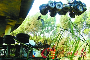 昨天上午10時,在消防戰士撤退之后,交通拯救人員和振戎燃氣搶險人員開始接班,負責清理已是一片狼藉的事故現場。此時工作人員還在用水沖刷氣罐,將罐壁殘留氣體沖刷干凈,并不時用測爆儀器確定罐內氣壓。因為事發地附近多為草叢樹林,無處落腳的巨型吊車只能在高架橋上作業。