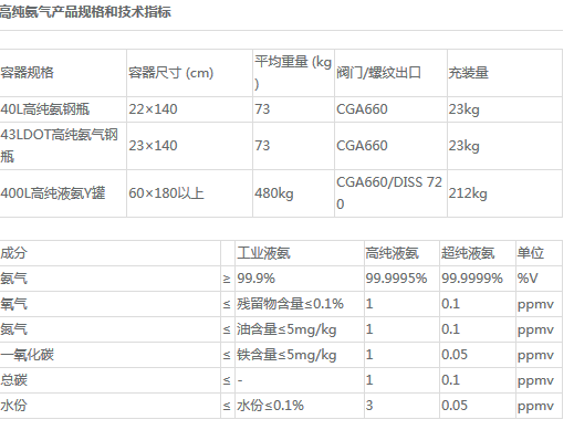 高純氨氣是無色,有毒,堿性、強腐蝕性的可燃氣體,帶有刺激性氣味,高濃度對 眼,皮膚和黏膜有刺激。氨氣的密度比空氣小,在標準狀況下的密度為0.7081g/L。氨氣極易溶于水,在常溫,常壓下,一體積的水中能溶解700體積的 氨氣。 液氨21.1°C的飽和蒸氣壓為7.78 kgf/cm2。采用40L鋼瓶、43LDOT鋼瓶Y罐或槽車灌裝。